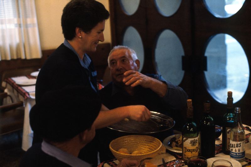 Restaurang, två äldre män får sin mat och sin dryck serverad vid bordet av en servitris.