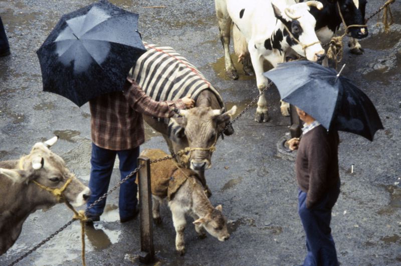 Djurmarknad, män med paraply tittar på nötboskap i regnet, två av djuren har fått regnskydd över ryggen.
