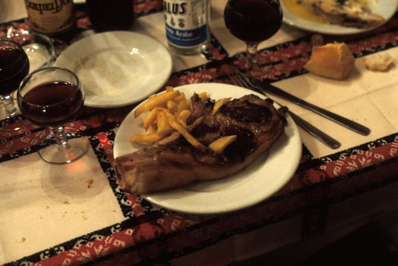 Måltid bestående av stor stekt köttbit med pommes frites, vid sidan om bröd och till det rödvin.