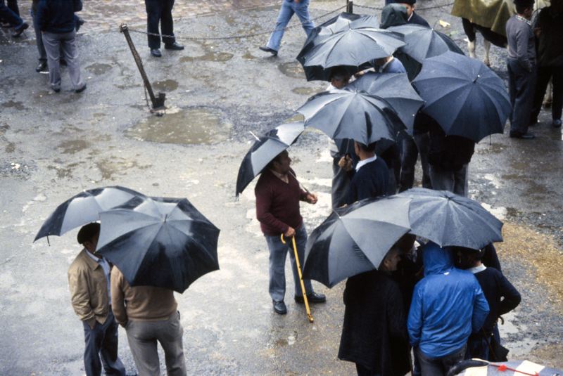 Djurmarknad, män med paraply tittar på nötboskap i regnet, djuret har fått regnskydd över ryggen.