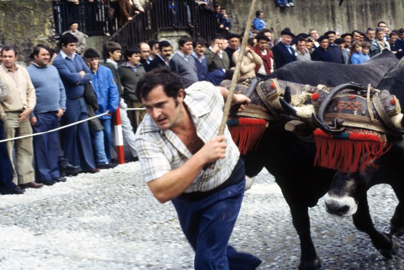 Underhållning, man med en käpp springer framför ett oxspann och drar i ett handtag som är fäst i oket.
