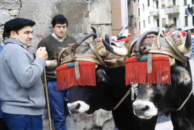 Underhållning, man med käpp står framför oxspann förspänt med slätok (?).