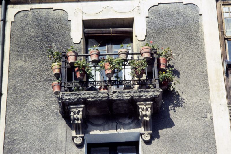 Del av byggnad, balkong med gjutjärnsräcke, utmed hela räcket hänger krukväxter.
