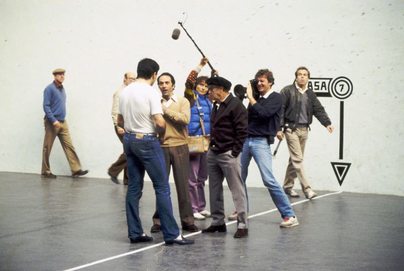 Man blir filmad och intervjuad på en pelotaspelplan.