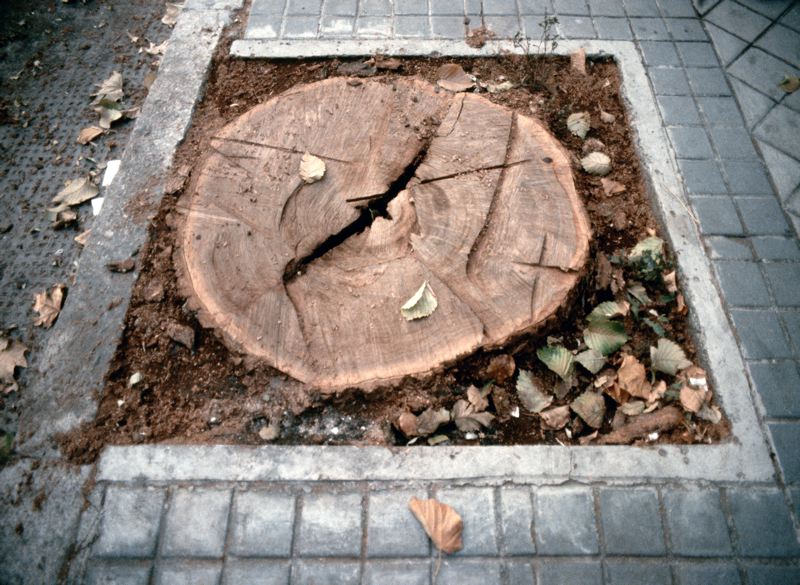 Plantering med nedsågat träd omgivet av kantstenar och stenläggningsplattor.