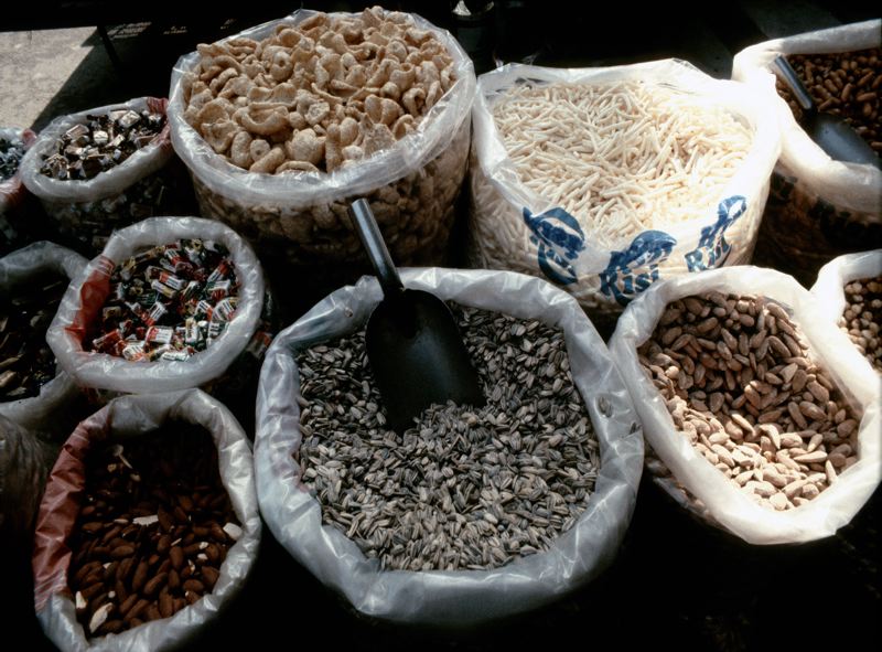 Torghandel, sötsaker, nötter, mandel och andra varor upplagda i plastsäckar.