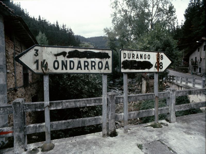 Väg med överstrukna vägskyltar, byggnader utmed vägen.