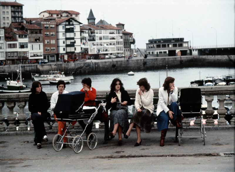 Stadsbebyggelse, sex unga kvinnor varav två med barnvagn sitter på en bänk vid hamnen.