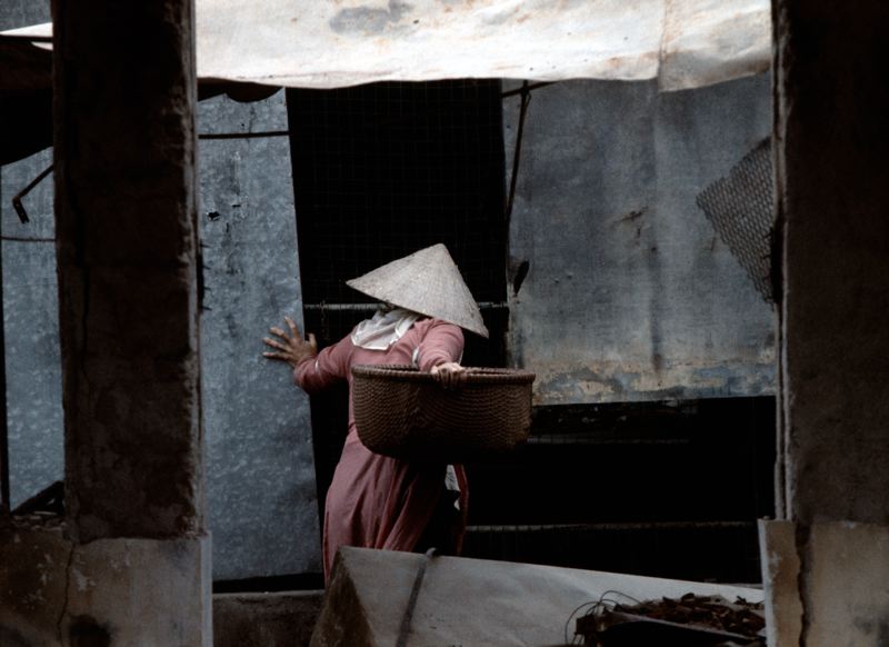 Kvinna som bär på en korg går mot en dörröppning.