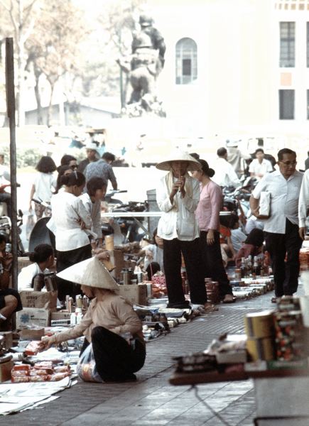 Gatuförsäljning, försäljare har lagt ut sina varor på marken, kunder går runt och tittar.