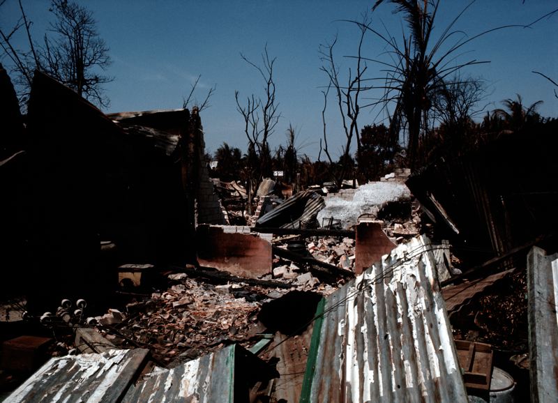 Rester av bybebyggelse, husruiner, metallskrot och brända träd. Förödelse efter bombdåd.