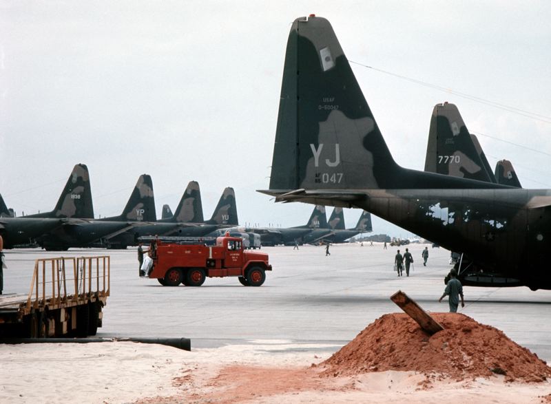 Militärt flygfält med uppställda plan och markpersonal syns gående eller körande diverse fordon så som brandbil eller truck.