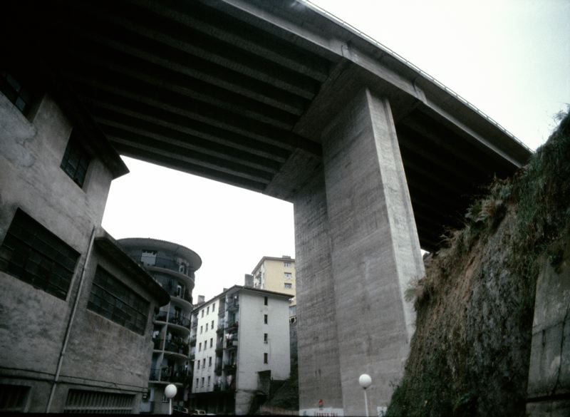 Stadsbebyggelse med viadukt i förgrunden.