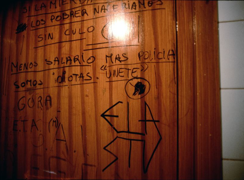 Vägg fullskriven med facklig propaganda, ELA är en spansk facklig organisation och ETA är en väpnad baskisk separatistorganisation som vill skapa en självständig baskisk stat.