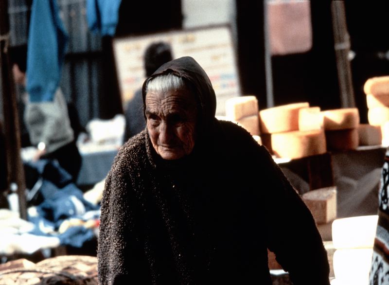 Äldre kvinna, i bakgrunden pågår gatuförsäljning av bl. a. ost.