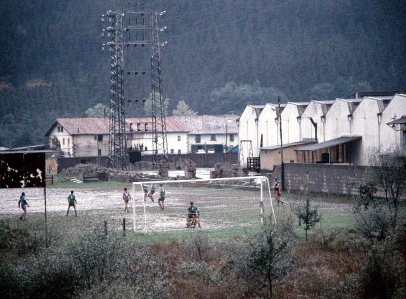 Bybebyggelse, män spelar fotboll på plan som ligger intill gaveln på stor byggnad, i bakgrunden skogsbevuxen bergssluttning.