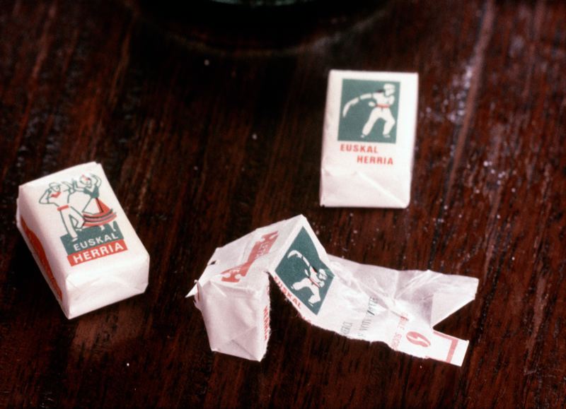 Sötningsmedel, portionsförpackade sockerbitar, dessa är förmodligen förpackade i Baskien eftersom de har texten euskal herria, vilket betyder Baskien.