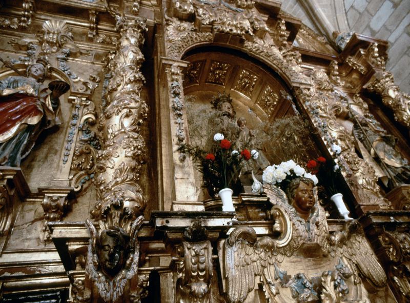 Kyrkointeriör, del av rikt utsmyckad altartavla.