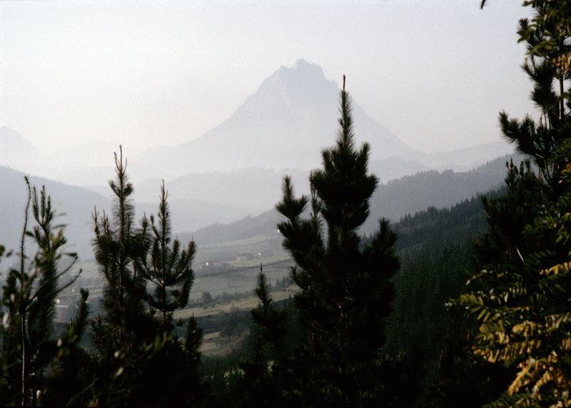 Jordbruksbebyggelse med byggnader, åkermark, skog och höga berg.