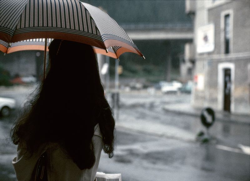 Stadsbebyggelse, kvinna med uppspänt paraply och ryggen vänd mot kameran går längs gata.