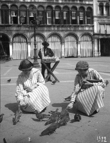 Maria och Margareta matar duvor. Gatuförsäljare.