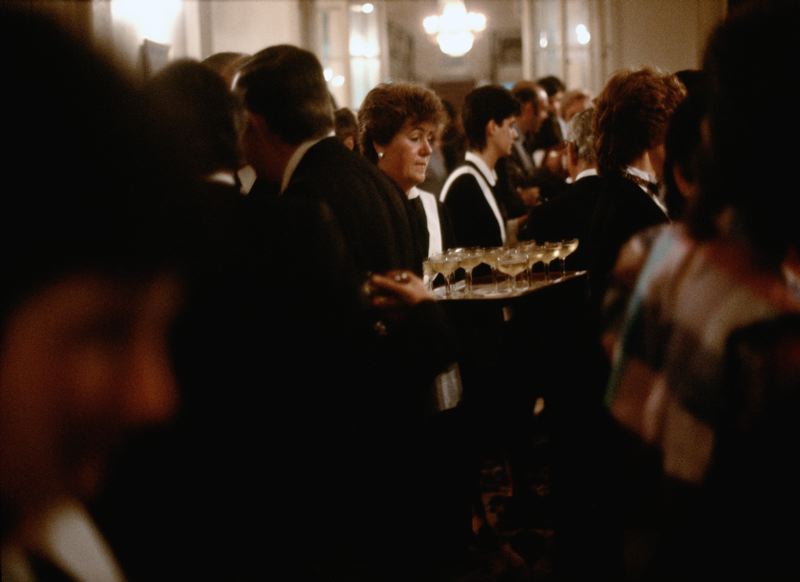Fest, serveringspersonal går runt bland gästerna och serverar champagne.
