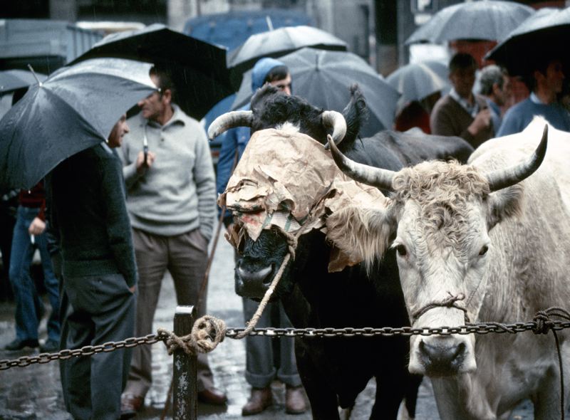 Djurmarknad, nötboskap tjudrad vid stängsel, människor går runt och tittar på djuren.
