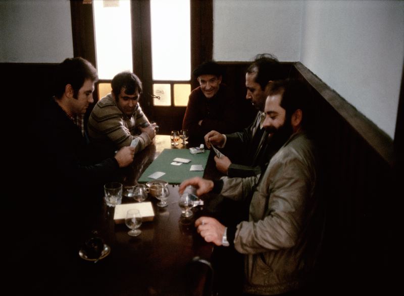 Män sitter på en bar och spelar kort och dricker sprit.