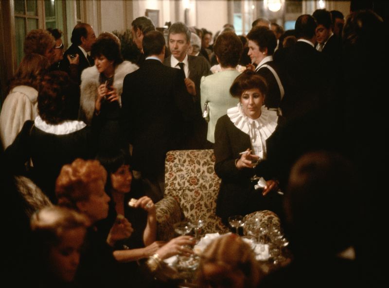 Gäster på fest, umgås, pratar och dricker champagne. Servitriser går runt och serverar bland gästerna.