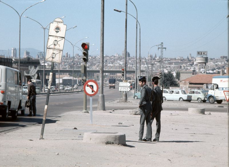 Stadsbebyggelse, huvudstad med lokal trafik, vägkorsning med trafikljus, till höger i bilden står två poliser.