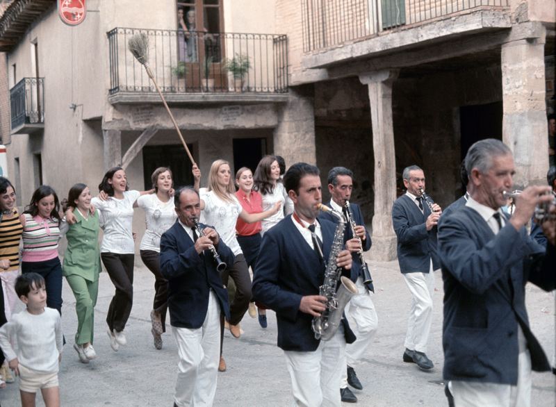 Stadsbebyggelse, kvinnor marscherar bakom spelande musiker, en av kvinnorna håller upp en kvast ovanför huvudet.