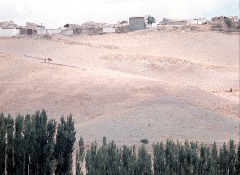 Bybebyggelse, två människor med en fullastad mula går längs en grusväg mot byn som syns i bakgrunden.