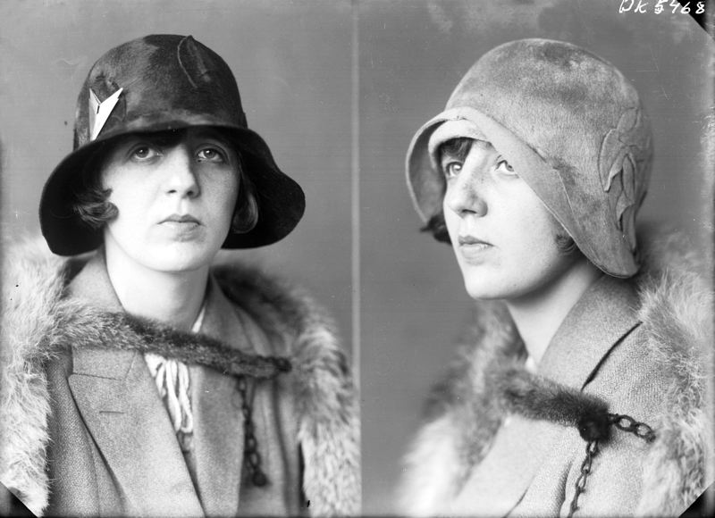2 kvinnoporträtt - modeller med damhattar från Malmö Stråhattsfabrik.