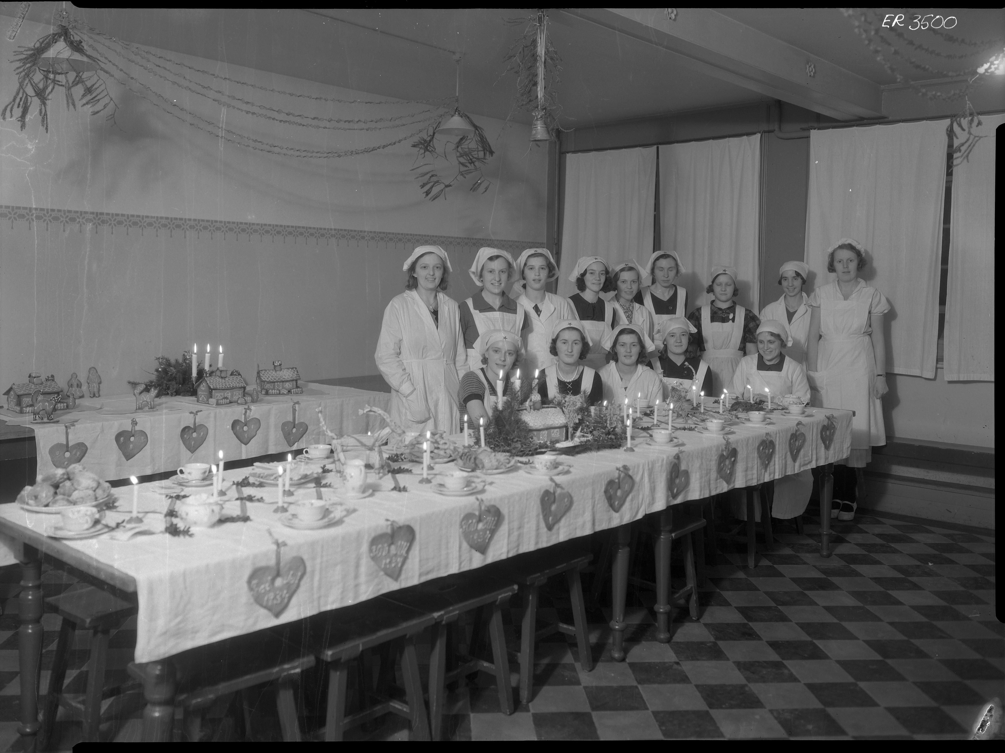 Flickor runt kakbord (jul) - Kommunala Mellanskolans skolkök första dagen. Mellersta Förstadsskolan