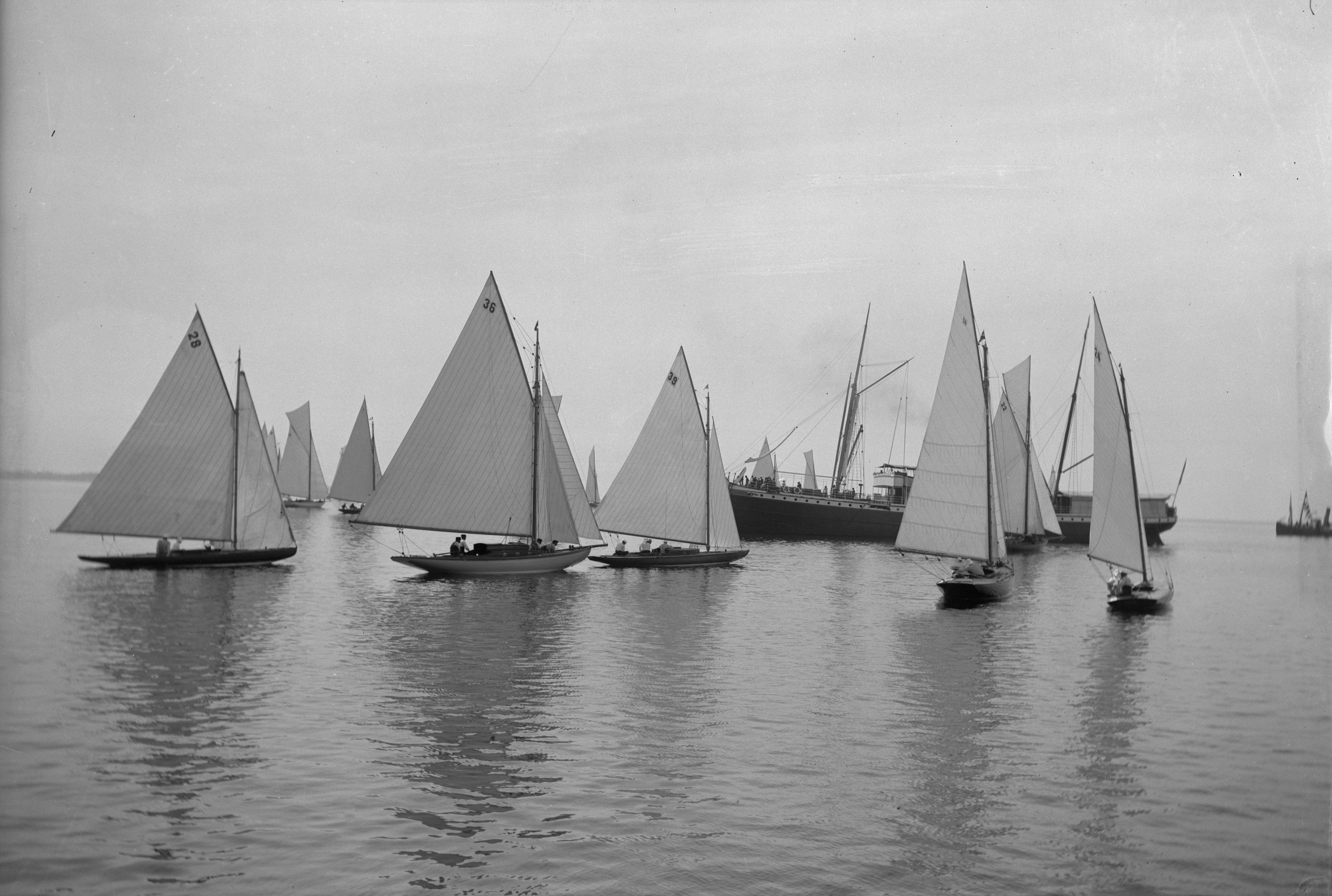 Segelbåtstävling, i bakgrunden passagerarfärjan "Rhea".; Segelbåtar och Passagerarfärjan "Rhea".