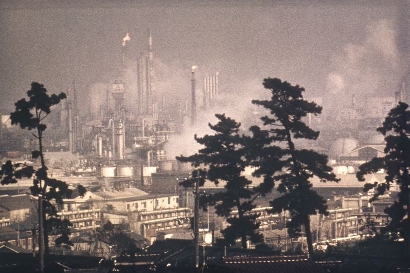 Stadsbebyggelse, industriområde med kemisk industri, hela området ser ut att vara täckt av dimma som förmodligen är luftföroreningar.