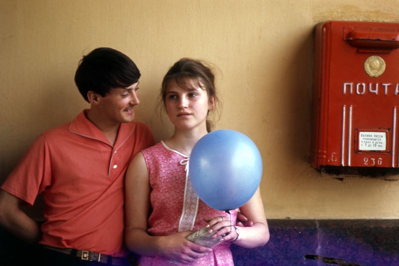En ung man och en ung kvinna som håller en blå ballong, står bredvid en röd postlåda.