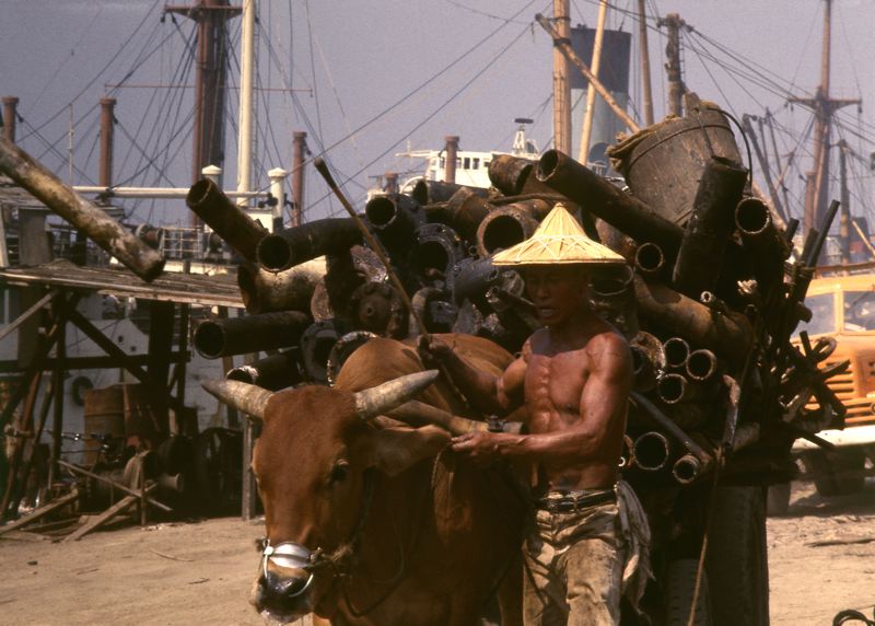 - Skrotning av fartyg sker ofta i Asien där det finns stor fattigdom och arbetet utförs i stort sett för hand och arbetarna bär endast skyddsutrustning tillfälligt. Vid nedmonteringen frigörs giftiga substanser som asbest, blyhaltig målarfärg och PCB och eftersom fartygen fylls med vatten för att stabilisera dem under nedmonteringen så släpps gifterna ut i miljön med vattnet. Många arbetare skadas också genom olyckor och en del dör på grund av att de andats in giftigt damm som asbest. Här lastas vagnar tungt med metallskrot och körs iväg.