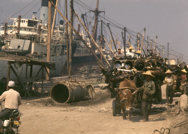 - Skrotning av fartyg sker ofta i Asien där det finns stor fattigdom och arbetet utförs i stort sett för hand och arbetarna bär endast skyddsutrustning tillfälligt. Vid nedmonteringen frigörs giftiga substanser som asbest, blyhaltig målarfärg och PCB och eftersom fartygen fylls med vatten för att stabilisera dem under nedmonteringen så släpps gifterna ut i miljön med vattnet. Många arbetare skadas också genom olyckor och en del dör på grund av att de andats in giftigt damm som asbest. Här lastas vagnar tungt med metallskrot och körs iväg.