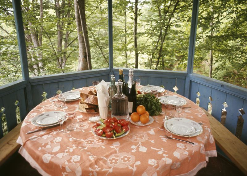 Paviljong med uppdukad måltid.
