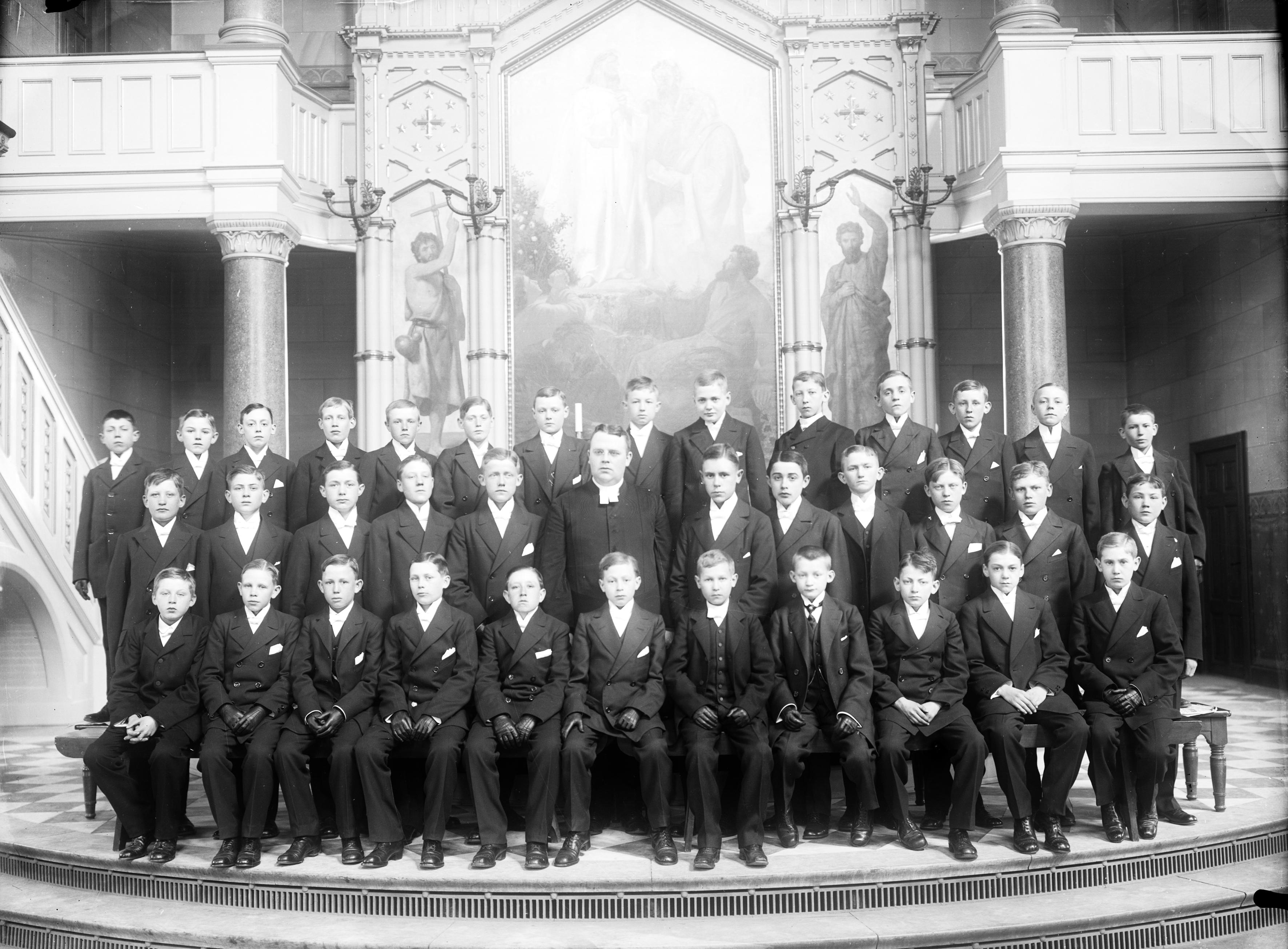 Grupp av konfirmander (pojkar framför altaret, S:t. Pauli kyrka, pastor Stoltz.
