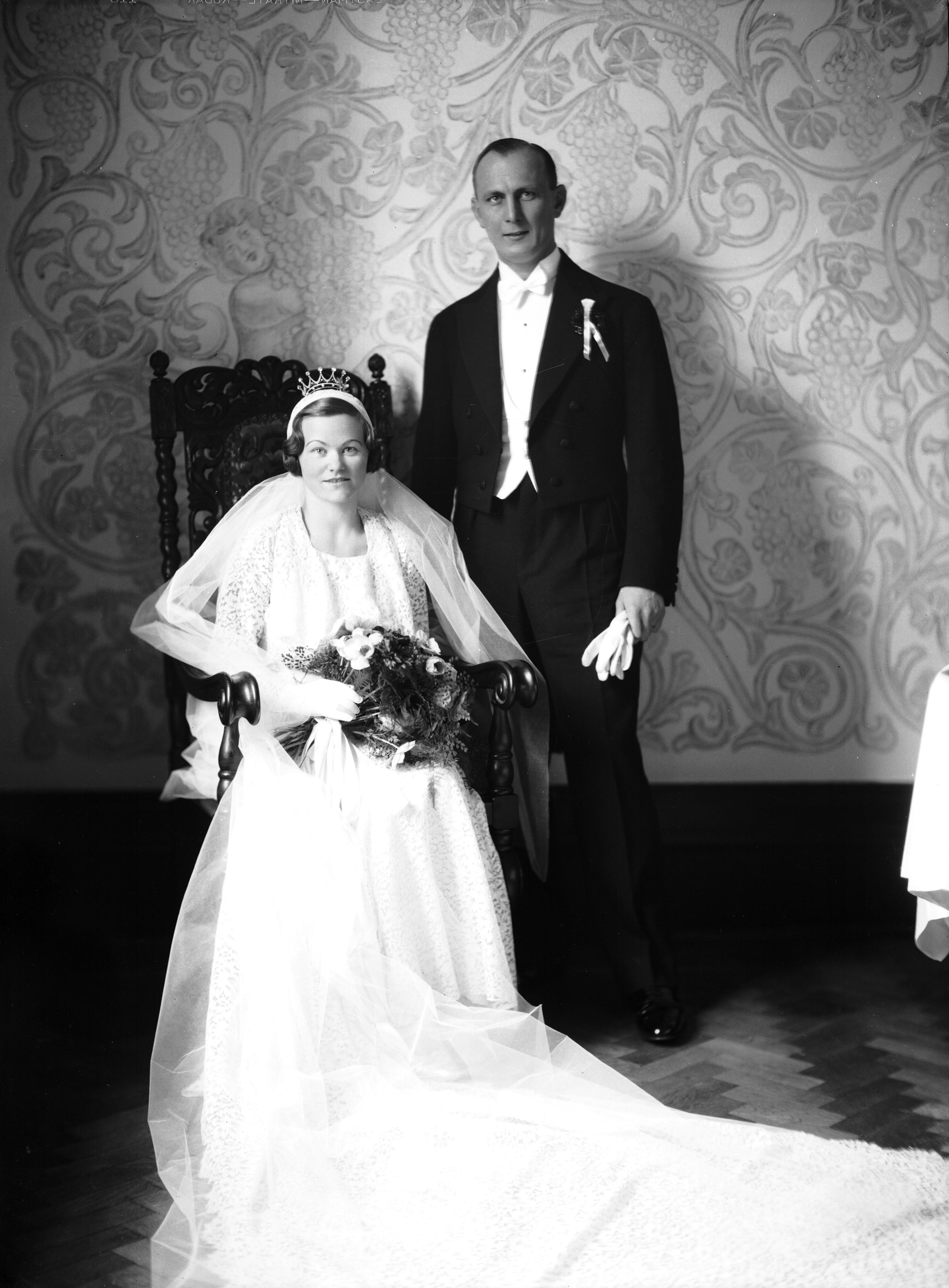 EK 000369 :: brudgumsklädsel, brudklänning, blombukett