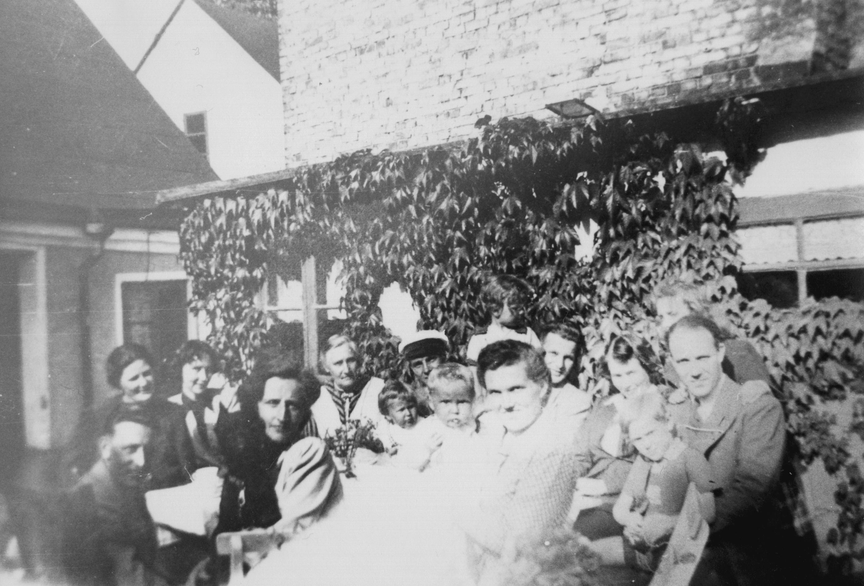 Sällskap på gården till Norra Bulltoftavägen 23. Repro av äldre bild.