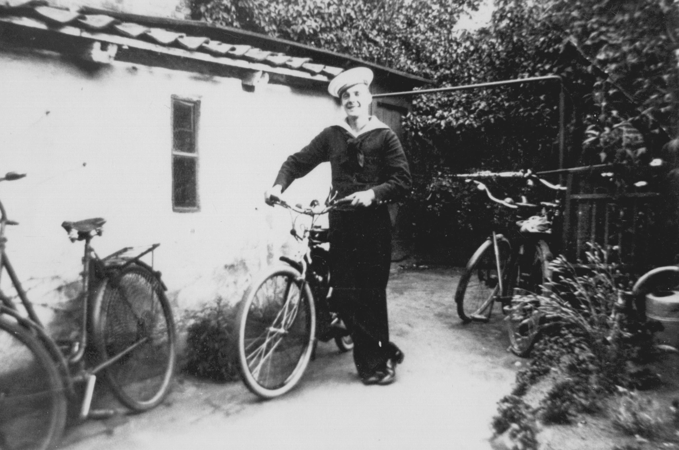 Man i sjömansuniform med cykel - Norra Bulltoftavägen 23. Repro av äldre bild.