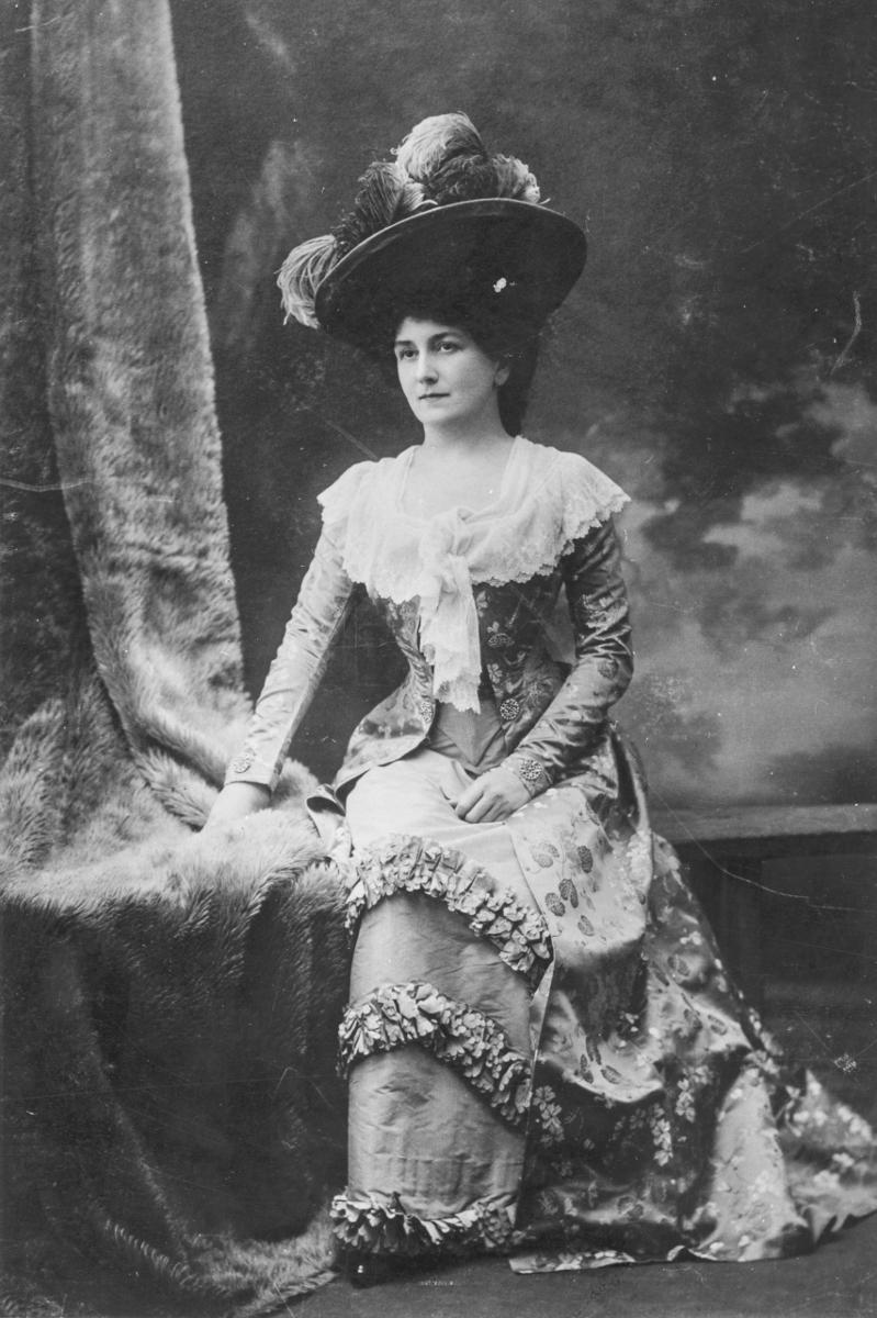 Sångerskan Sigrid Arnoldson i präktig dräkt, ateljebild.