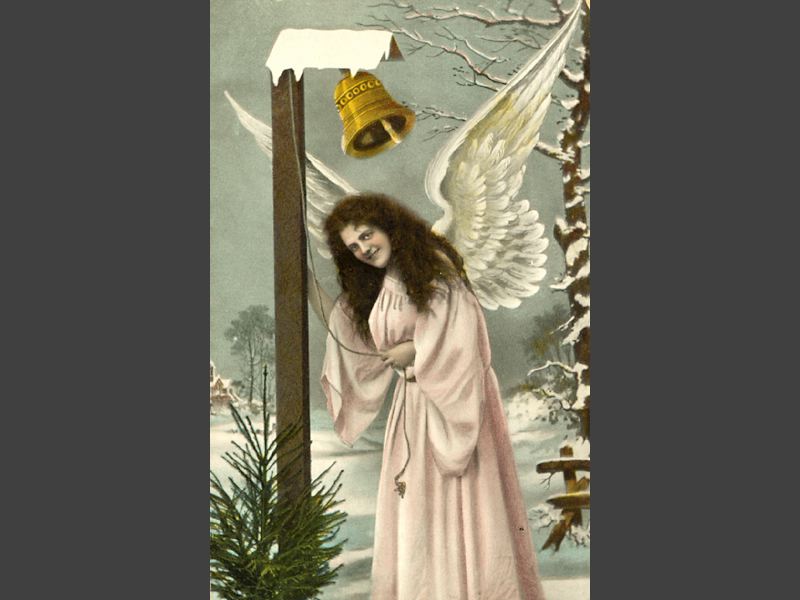Kortets framsida: En ängel i vinteromgivning vid stolpe med klocka.