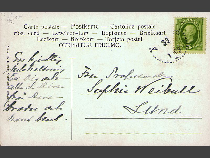 Kortets baksida: "brevkort" på några olika språk. Grönt frimärke à 5 öre, poststämplat, otydligt. Vid kortets vänstra kant tryckt: "Alex. Vincents Kunstforlag. Eneret No. 57/ IV"