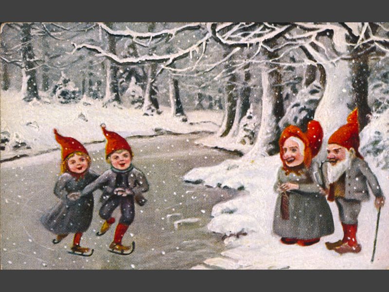 Kortets framsida: en familj tomtenissar vid en frusen bäck, medan det snöar. Barnen åker skridskor.