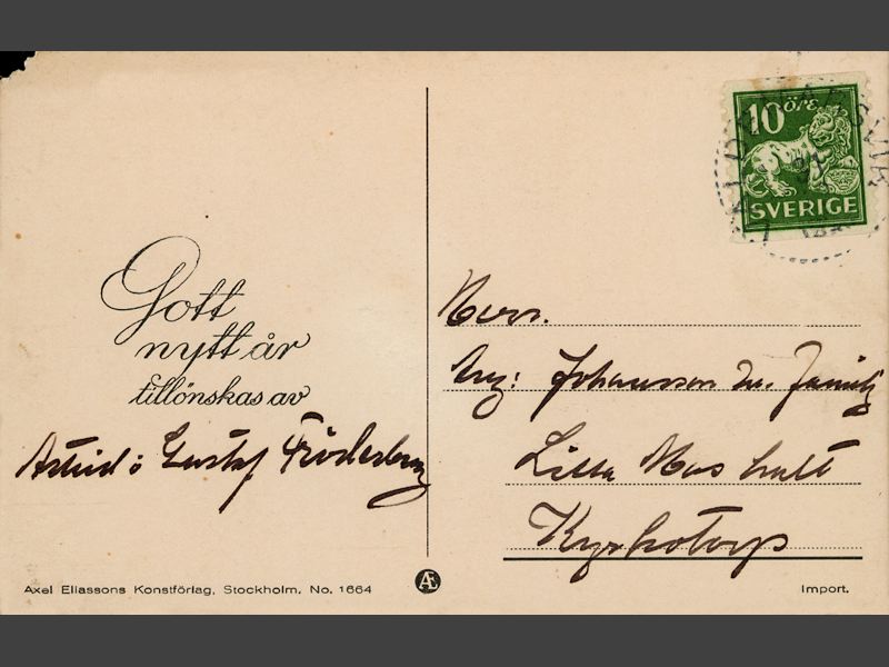 Baksidan av kortet: tryckt "Gott / Nytt år/ tillönskas av/ (handskrivet) Astrid o Gustaf Fröderberg". Adressen, handskrift, bläck: " Herr./ Ing. (?) Johansson m. familj/ Lilla Mors hult/ Kyrkotorp". Längs kortets nedre västra sida tryckt:" Axel Eliassons Konstförlag, Stockholm, No. 1664". I högra nedre hörnet: "Import".