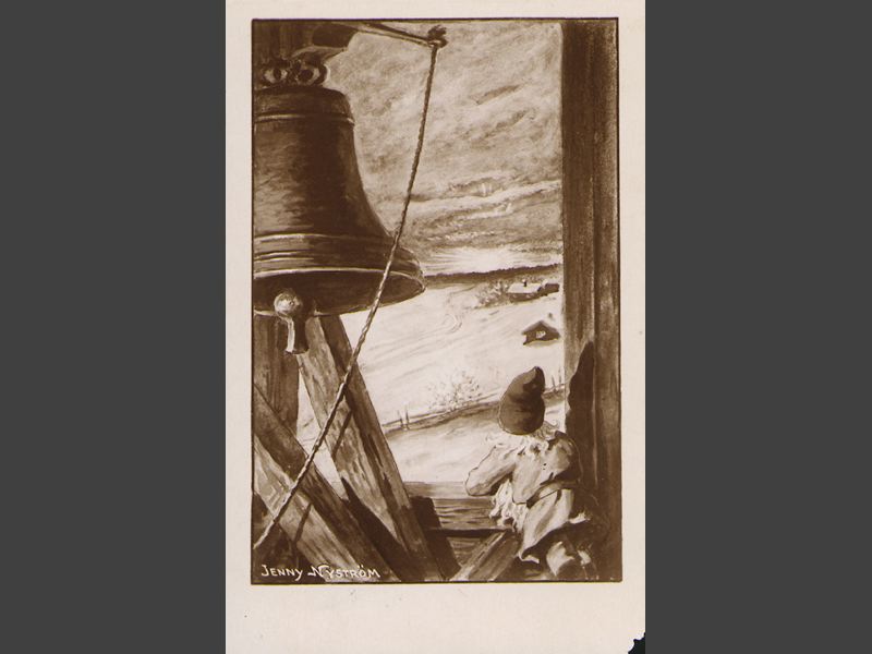 Kortets framsida: Jenny Nyströms julmotiv. En jultomte vid kyrkklockan iakttagande ett snölandskap i gryningen.